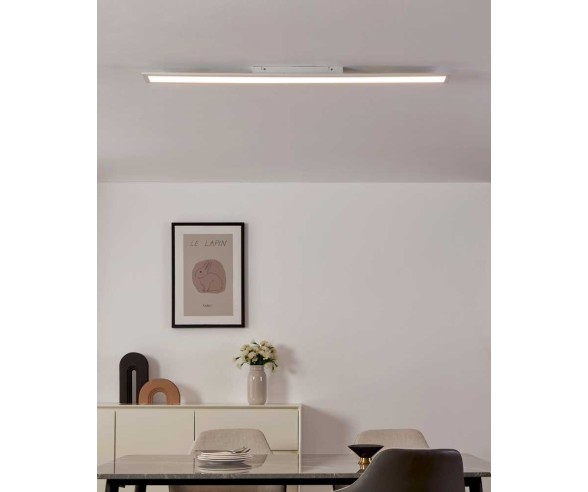 The SALOBRENA-Z LED ceiling light, from the Smart Home connect.Z assortment, consists of a 120x10 cm rectangular frame in white metal and a luminous surface in white plastic. The peculiarity of this panel is the suspended effect created by the ceiling support hidden by the structure itself.