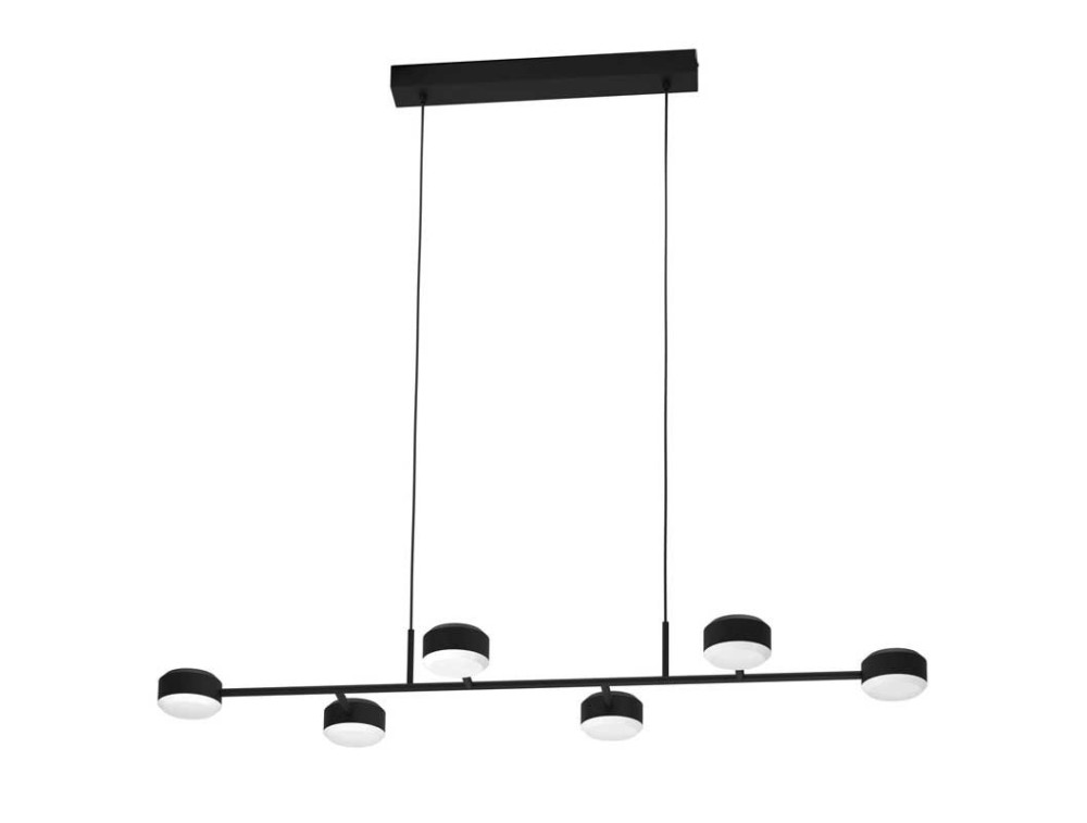 The CLAVELLINA LED pendant lamp is composed of a black metal arm with six light heads at the ends. The LEDs integrated under the white acrylic lampshade provide a warm and enveloping light.
