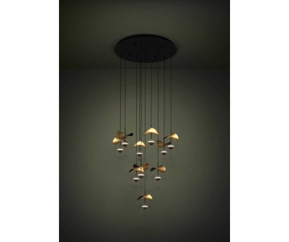 Modern design chandelier with black steel structure and black and gold elements. Latest generation dimmable LED.