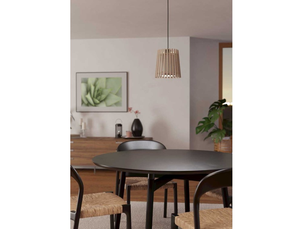 Pendant lamp with black steel structure and brown wood and fabric diffuser.