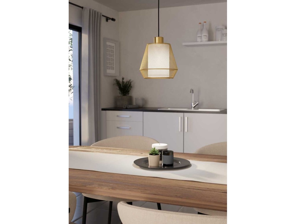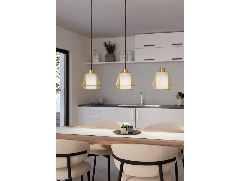 Kitchen chandelier with brushed brass steel diffuser and white fabric lampshade inside.