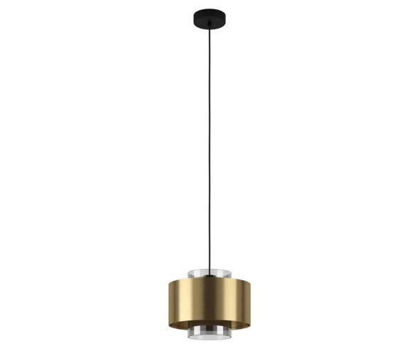 The DUGLIA pendant lamp consists of three brass-colored metal shades and a black-transparent smoked glass inner body. The shades hang from a long black metal canopy via black fabric cables.