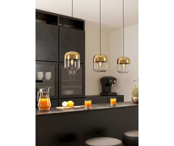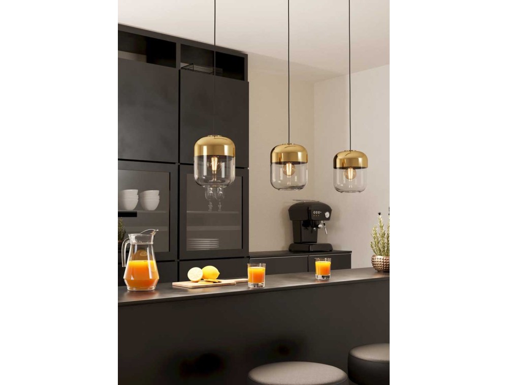 Kitchen chandelier in black and bronze steel with diffuser in clear and gold vaporized glass.