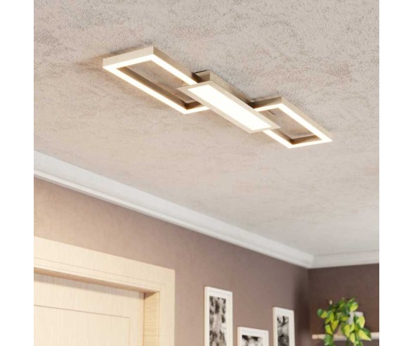 The MONIROTE LED ceiling light is composed of a metal body with two rectangular profiles in matt nickel metal. The LEDs integrated into the metal profiles and the central light surface emit a pleasant light as required and are not visible thanks to the white plastic ceiling lights