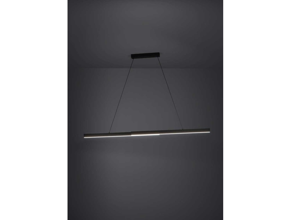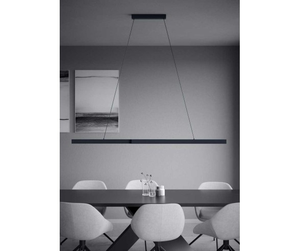 Modern design chandelier with black aluminum and metal structure, white polycarbonate diffuser from which the LED light comes out.