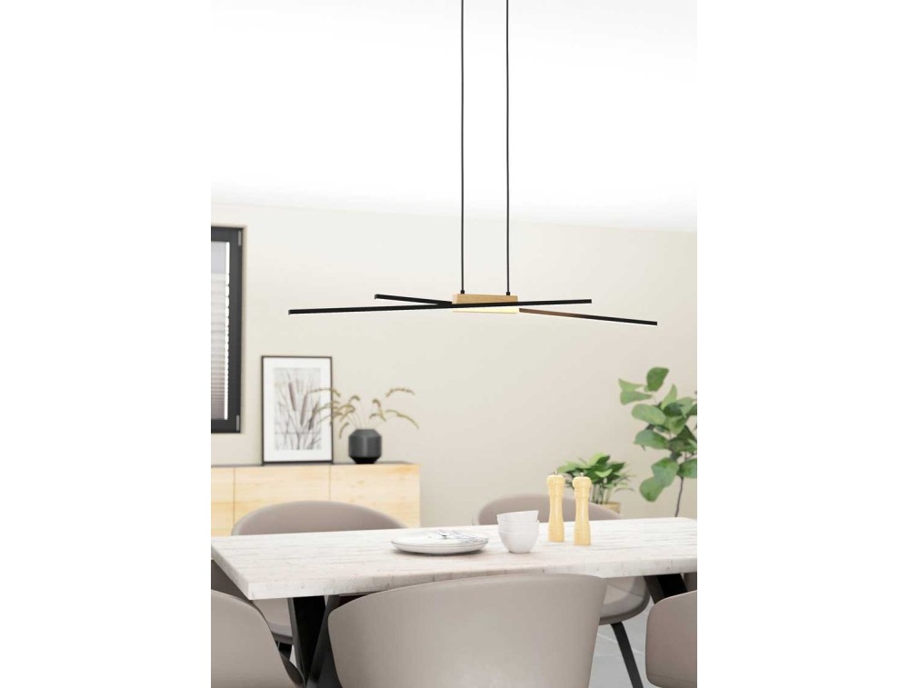 The PANAGRIA LED ceiling light combines black metal and natural wood in an elegant oak design. Two thin, staggered black LED profiles are fixed to a small wooden base.