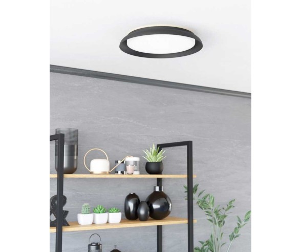 Ceiling lamp ideal for a kitchen or living room, in black steel and brown wood. Integrated LED with 5-year warranty.