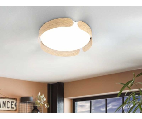 The VALCASOTTO LED ceiling light is composed of a white round LED element, a decorative frame with three elements in oak, mocha or black veneer