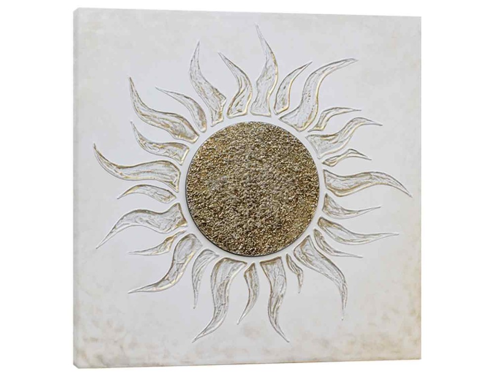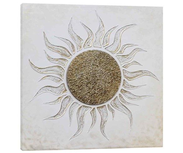 Original wall picture with modern design, model Sole bianco, with silver relief decoration that reproduces a large sun on a square white background. The relief is pickled, so as to give a touch of originality and depth. The central element is embellished by the silver leaf decoration and by the material processing that gives the whole picture an original effect.