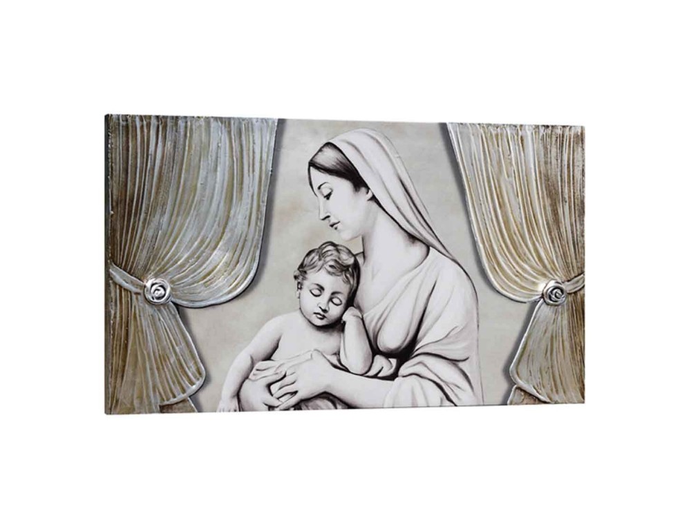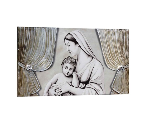 New bedside table with a classic taste depicting a sweet mother with son from the Maternità collection with drapery of the Pintdecor brand, printed on canvas with manual relief decoration and silver leaf application. Available in several variations.
