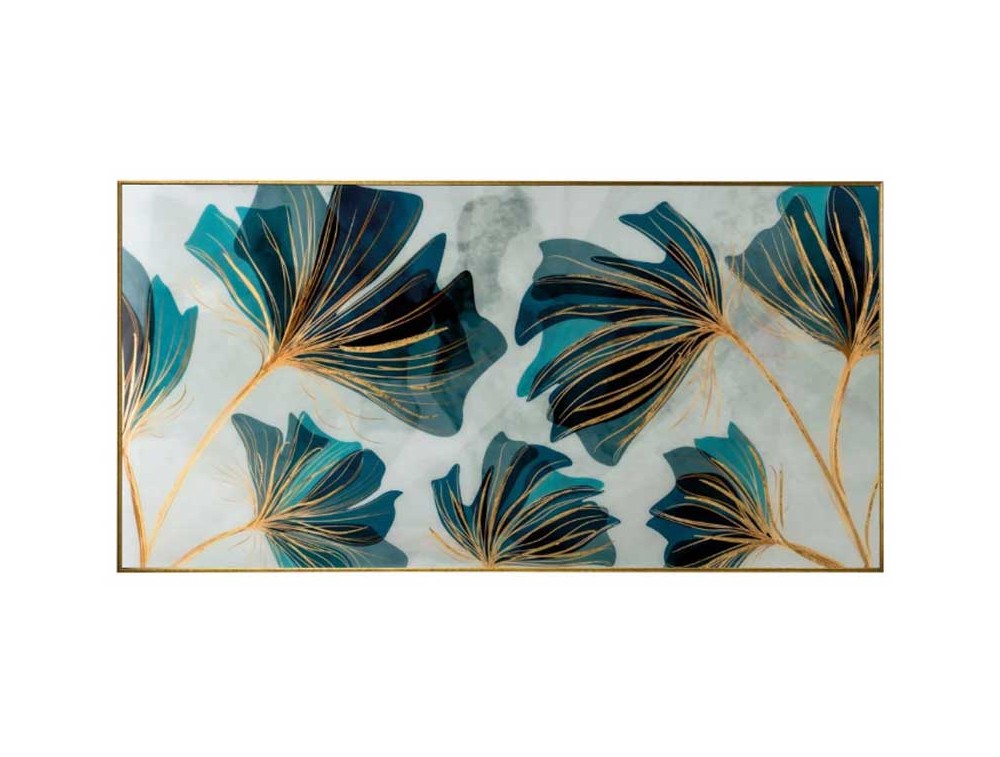 Uses the contrast between cool tones and gold lines to create an elegant and dynamic work. The style is Abstract, Modern, Luxurious with Cool Tones, or Aquatic Glamour. It's a perfect piece for a space with light walls that requires a strong focal point of color and metallic finishes. Shipping is free and the warranty is 2 years.