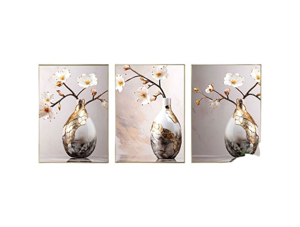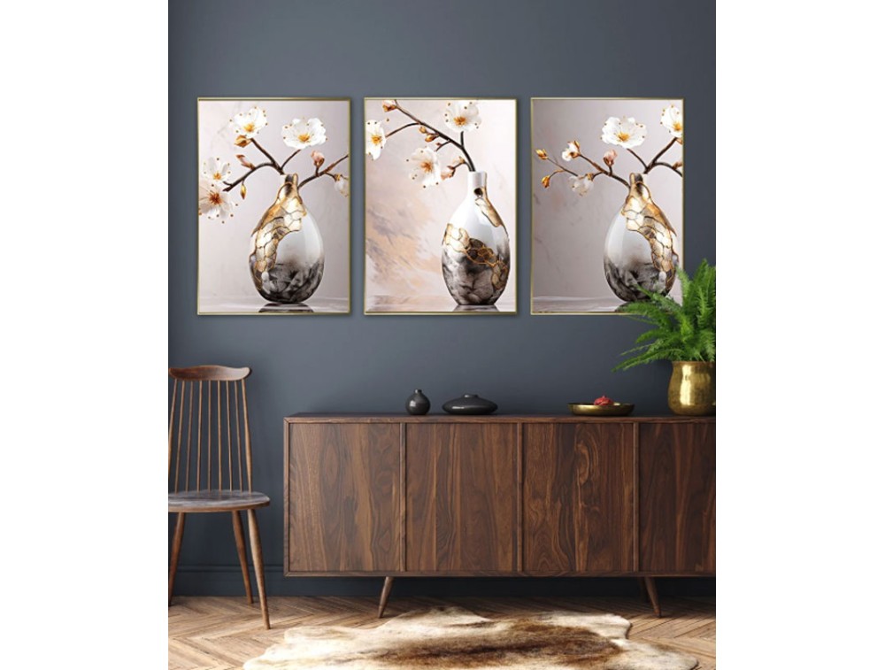 Abstract painting with vases, image printed on high-quality polymer paper applied to a high-density MDF panel. Each painting is entirely decorated with glossy resin, crystals and colored stones, tone-on-tone brushstrokes, and textured pastes to enhance the piece. Gold frame included.