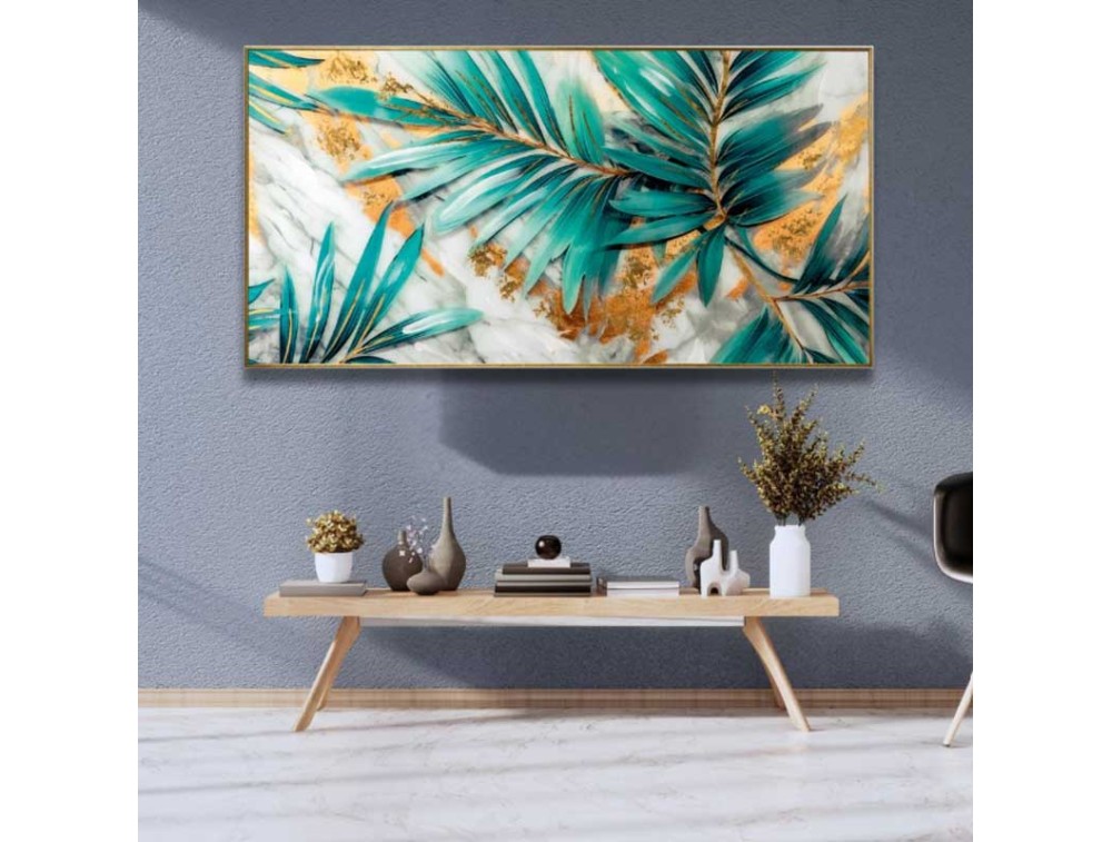 Fusing exotic natural elements with the opulence of precious materials, this painting creates a powerful focal point. This painting instantly conveys a sense of freshness, vitality, and sophisticated sophistication. It's ideal for rooms with neutral walls or cool tones like blue or gray. Shipping is free and the warranty is 2 years.
