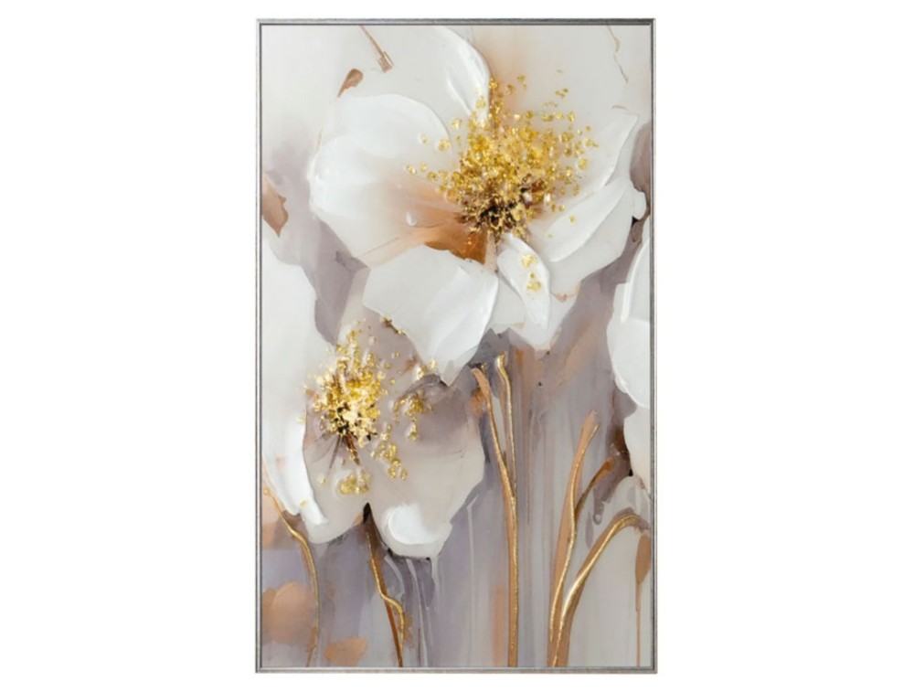 Floral painting, image printed on high-quality polymer paper and applied to a high-density MDF panel. Each painting is entirely hand-decorated with glossy resins, crystals, and colored stones, with tone-on-tone brushstrokes and textured pastes applied to enhance the piece. A choice of white, gold, or silver frame is included. Ideal for the kitchen, living room, and bedroom.