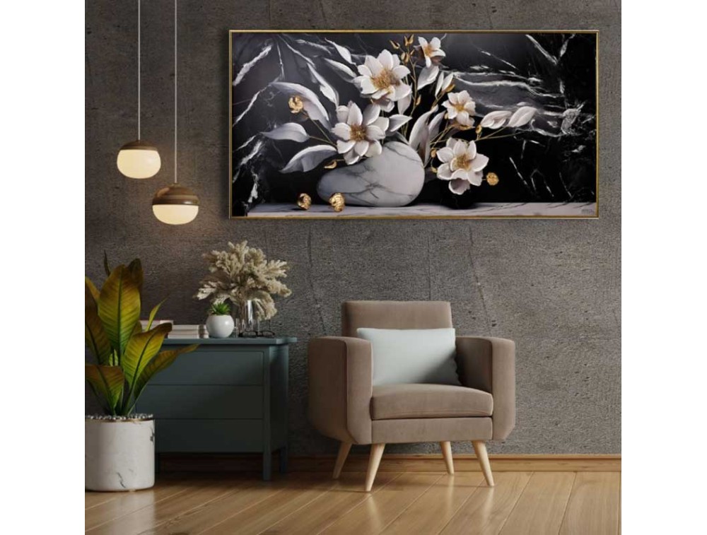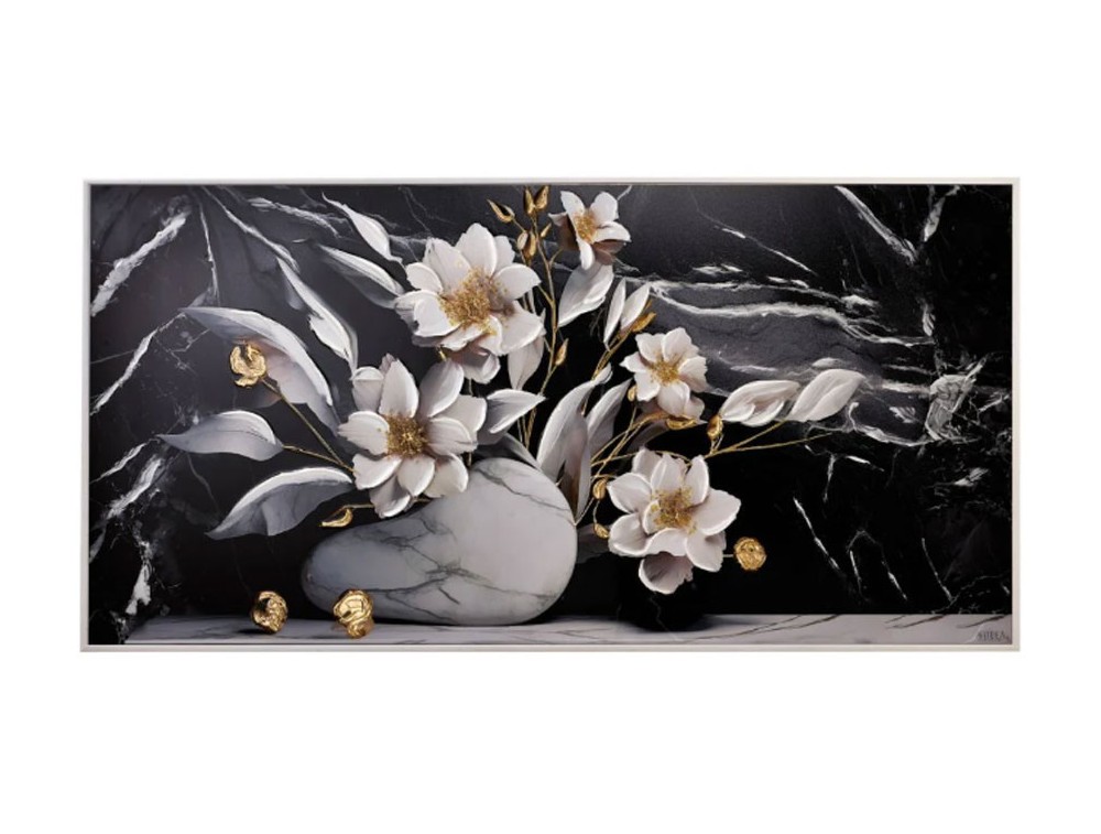 Floral painting, image printed on high-quality polymer paper and applied to a high-density MDF panel. Each painting is entirely hand-decorated with glossy resins, crystals, and colored stones, using tone-on-tone brushstrokes and textured pastes to enhance the piece. A frame is included, available in gold, silver, or white. Ideal for the kitchen, living room, and bedroom.