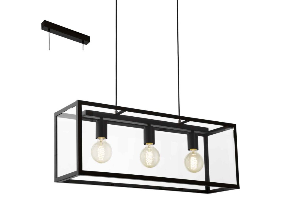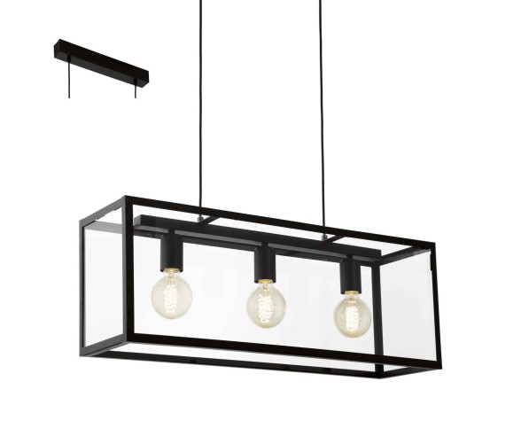 Eglo chandeliers, rustic suspension lamp made with black finish steel structure and transparent glass diffuser