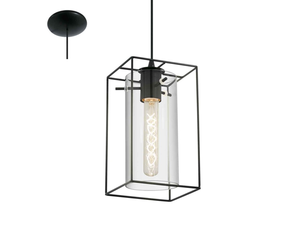 Eglo chandeliers, rustic suspension lamp in black steel and smoked glass diffuser.