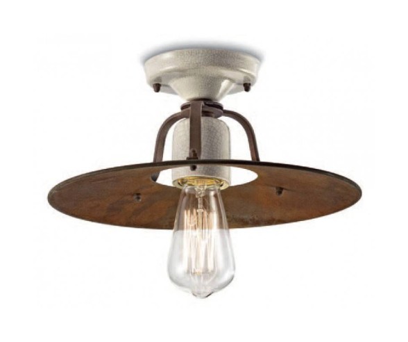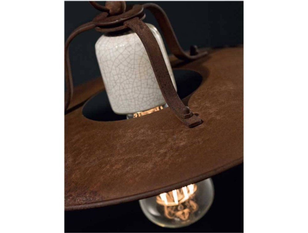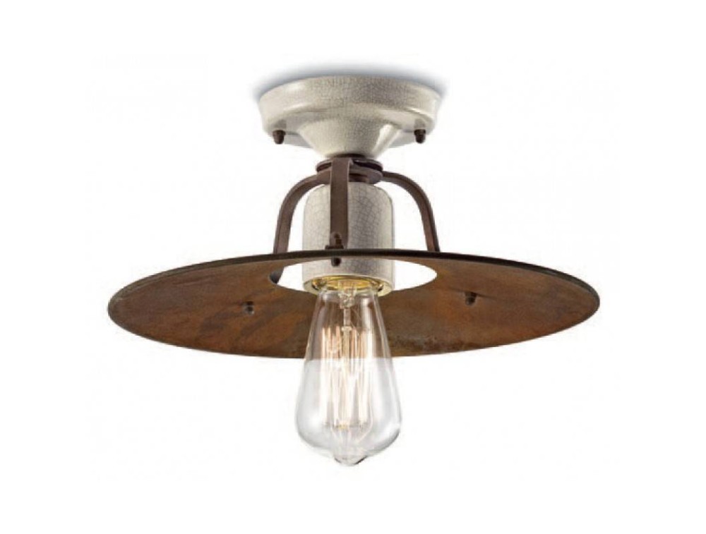 Rustic ceiling lamp made with metal structure in rust finish and craquelè ceramic diffuser. With a wide crown and essential design, this lamp, with its lightly lit colors and its lived-in taste, is simple and timeless. Pure light without shielding.