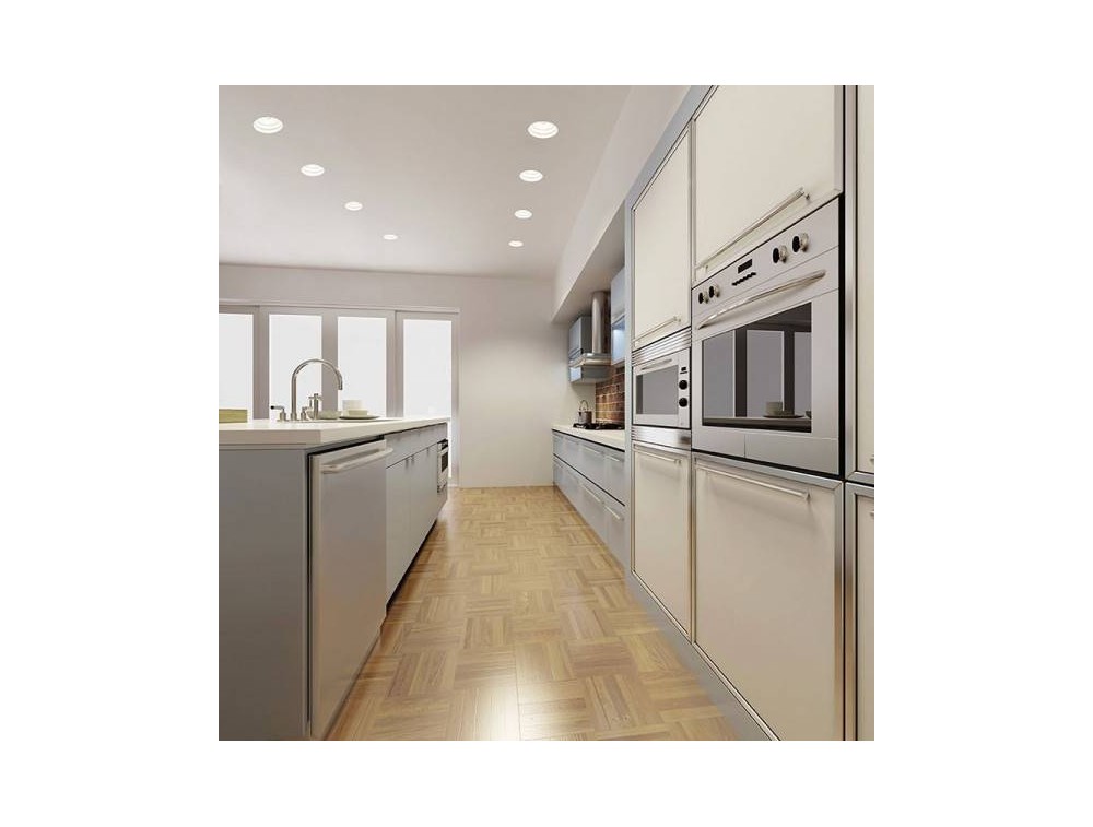 Recessed spotlight made with paintable plaster structure, ideal for applications in plasterboard ceilings. Lamp with an essential design that guarantees a direct functional light downwards without invading the furnishing style of the environment. The circular plaster structure surrounds the light source, leaving space to light the spot in which it is placed.