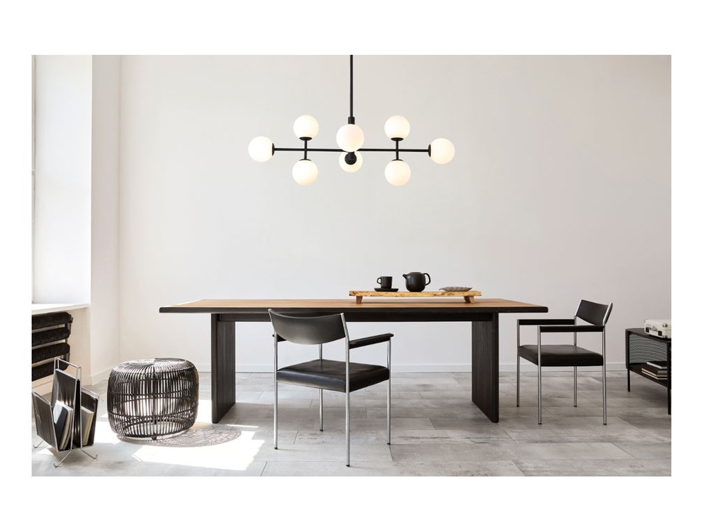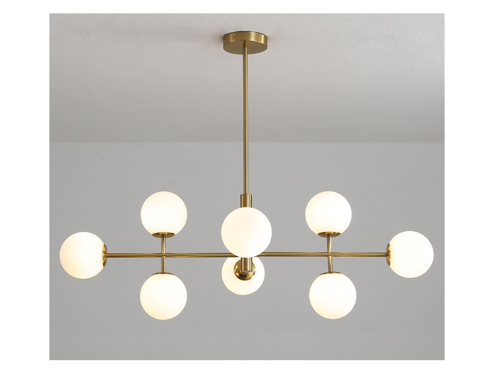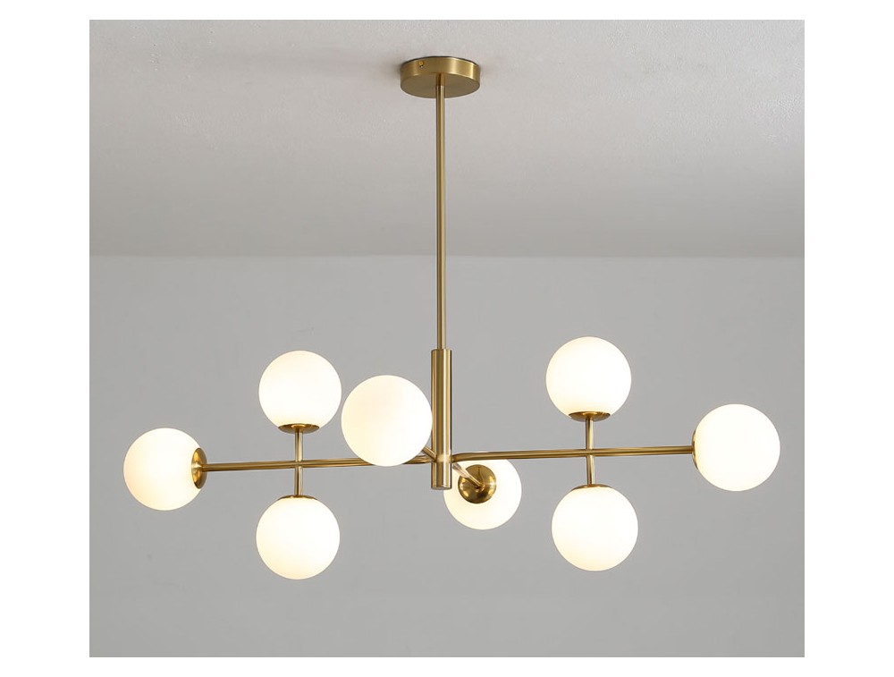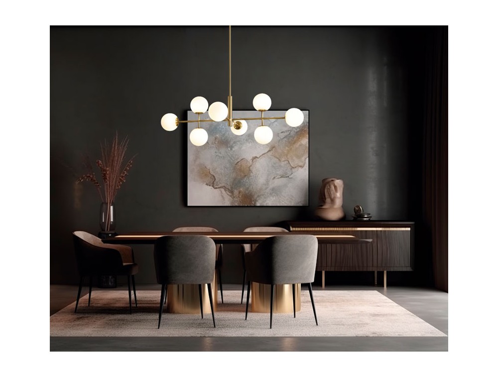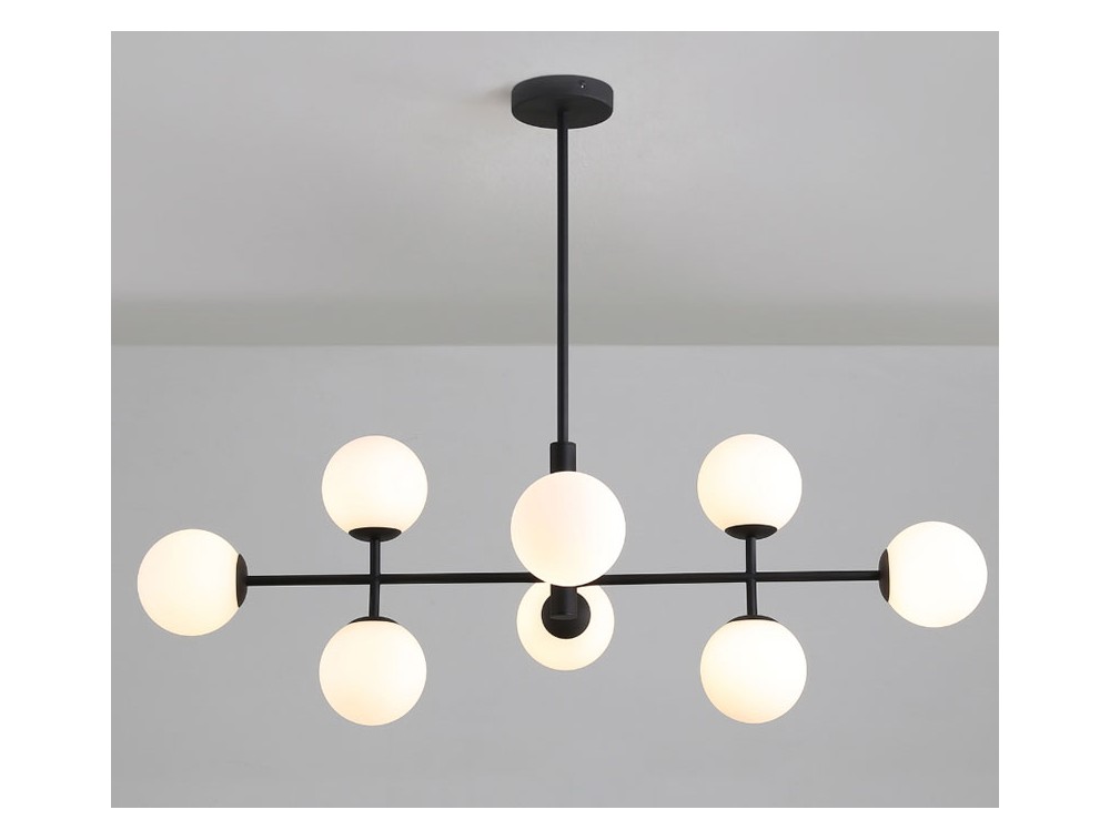 8-light pendant lamp with an iron frame and glass diffusers. Ideal for illuminating and decorating the kitchen, living room, and bedroom. Available in black and gold finishes, which lend a simple and elegant look. Given its horizontal extension, it is an excellent choice for illuminating rectangular dining tables or large islands, as it extends along the length of the tabletop.