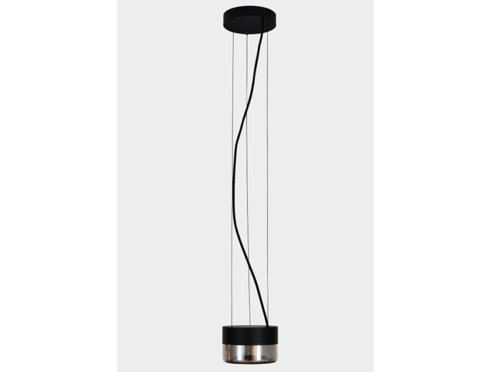 LED pendant light made of aluminum with a glass diffuser. IP65 protection allows for both indoor and outdoor use. Perfect for kitchens, living rooms, bedrooms, and hallways. It stands out for its sculptural and ultra-modern design, which plays with the transparency of glass and the precision of metal to create a hypnotic lighting effect. Colors: Black and smoke.