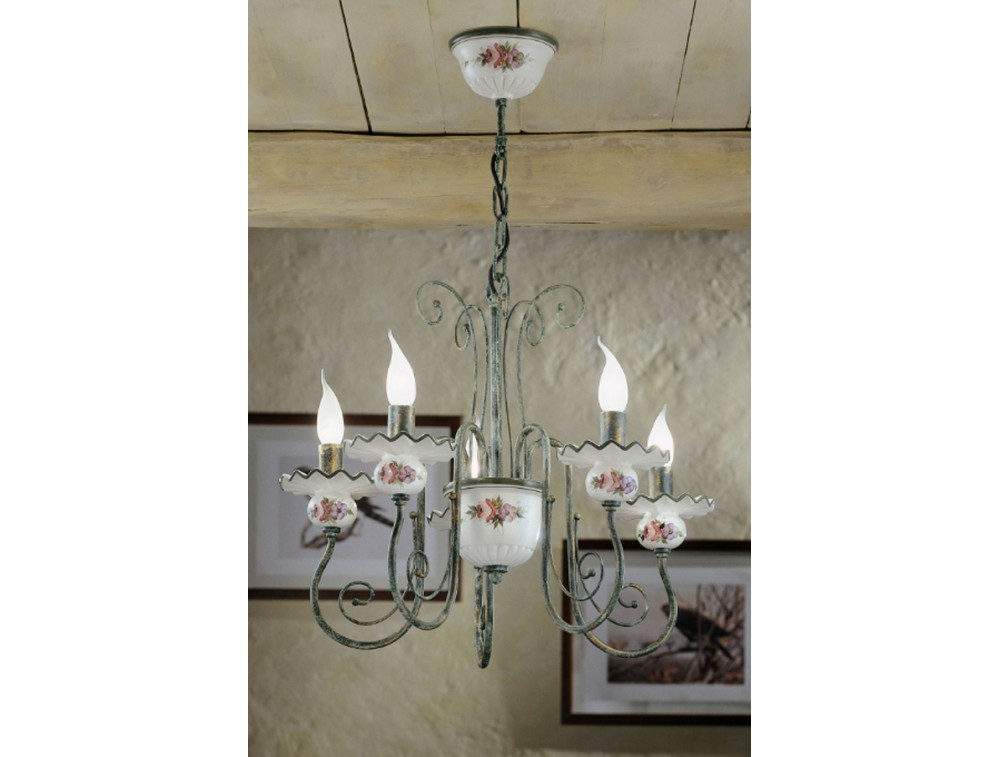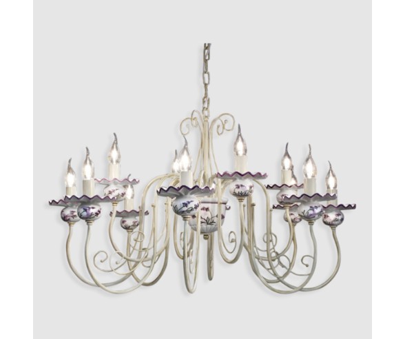 Pendant lamps with 3, 5, 8, or 12 arms, featuring a painted and antiqued brass structure and a ceramic frame. Hand-crafted floral decorations make each lamp a jewel. Click the link to customize the lamp by changing the decoration or the frame color.