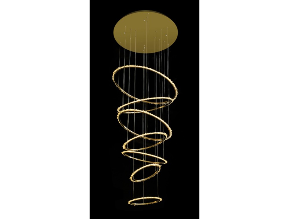 Suspension composed of quartz crystals fixed in seven satin-finish metal rings. Ideal for decorating and illuminating kitchens, living rooms, bedrooms, and hallways. Available in satin gold or satin nickel.