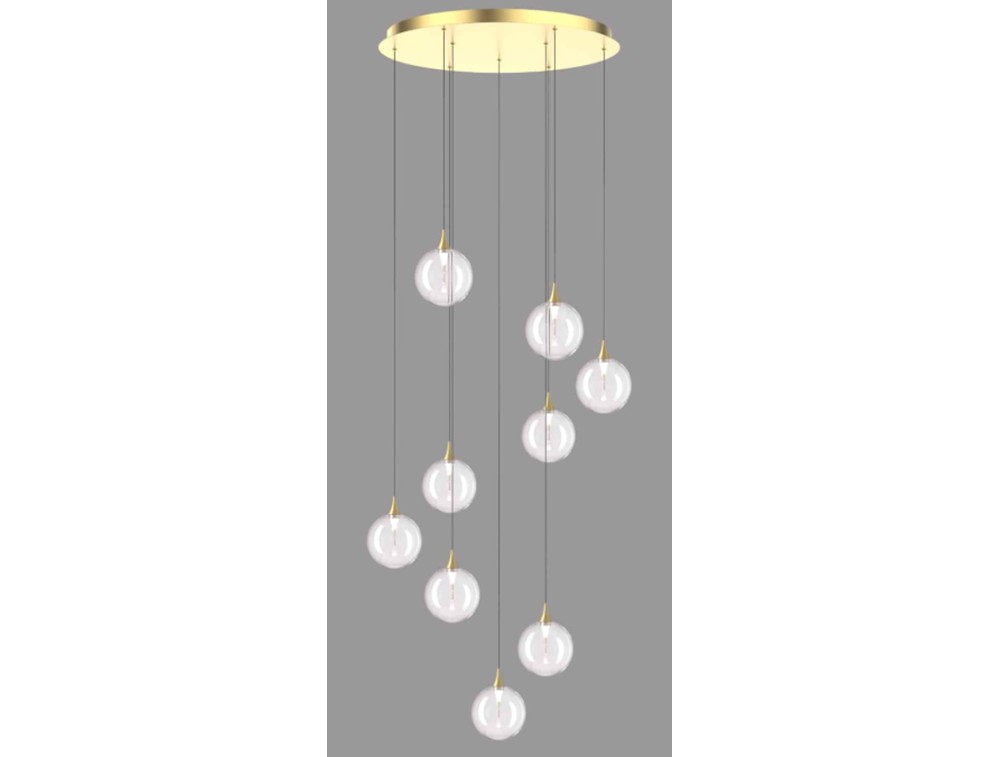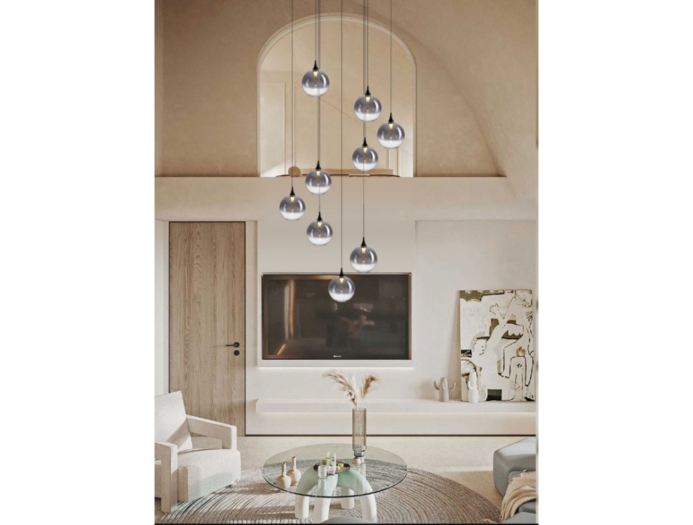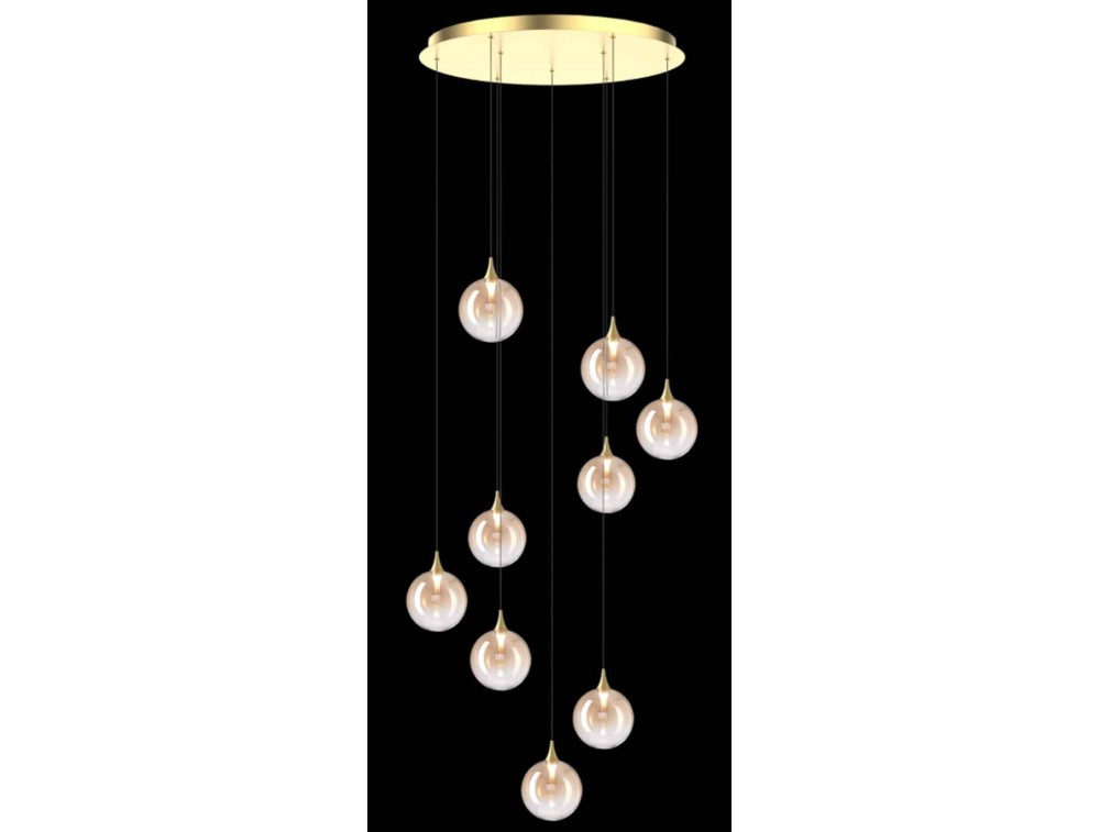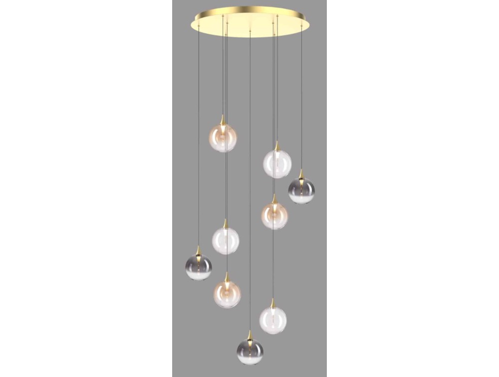 Suspension with 9 blown glass spheres and a metal base. Available in matte black with smoked or clear glass, satin gold with clear or amber glass, or satin gold with mixed glass. IP20 protection. Ideal for kitchens, living rooms, and bedrooms.