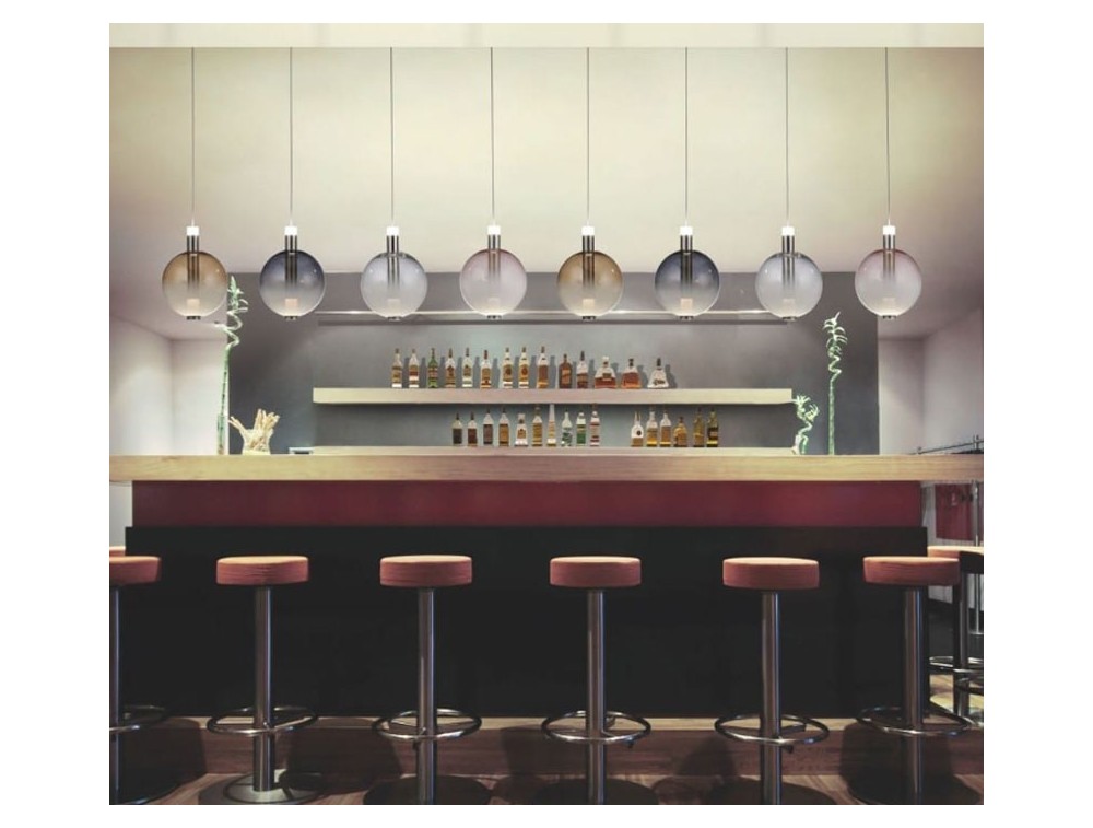 A light that rises in the morning, ushering in a new day. Made of metal with a blown glass diffuser in pink, smoked, amber, or white. Satin gold or satin nickel frame. Ideal for kitchens, living rooms, hallways, and bedrooms. IP20 protection and integrated LED. Ideal for series installation to create unique combinations.
