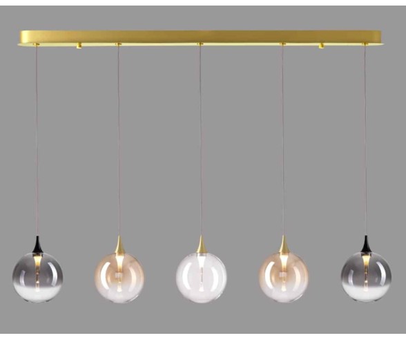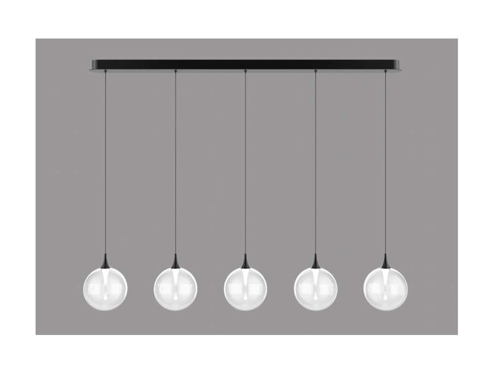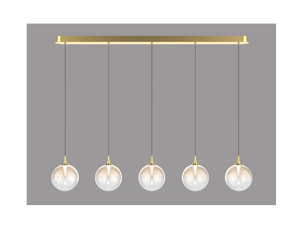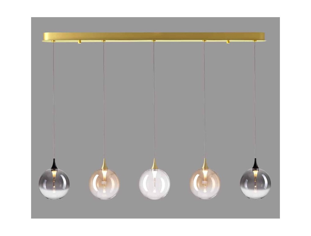 Linear suspension with 5 blown glass spheres and a metal base. Available in matte black with smoked or clear glass, satin gold with clear or amber glass, or satin gold with mixed glass. IP20 protection. Ideal for kitchens, living rooms, and bedrooms.