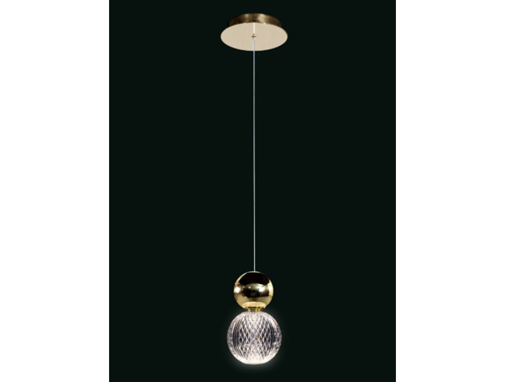 Pendant lamp composed of a metal frame and acrylic spheres, lacquered in gold or chrome. Ideal for illuminating and decorating kitchens, living rooms, hallways, and bedrooms. Integrated LED light. Its visually striking design features a dense composition of spheres with mixed finishes, creating a truly sculptural effect. IP20 protection.