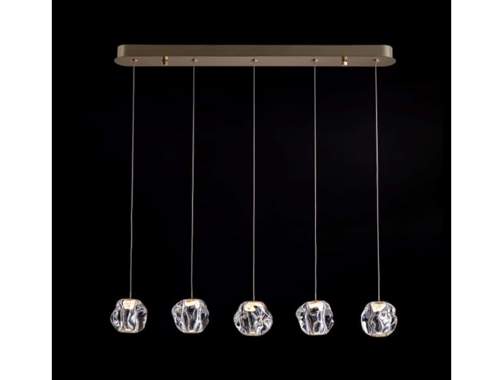 Like a pebble, smoothed by time and shaped by the elements, it creates facets of light. Made of metal with an acrylic diffuser, available in polished chrome or satin gold. Ideal for the kitchen, living room, and bedroom. Integrated LED. IP20 protection. Available with 5 or 14 lights.