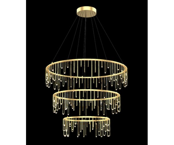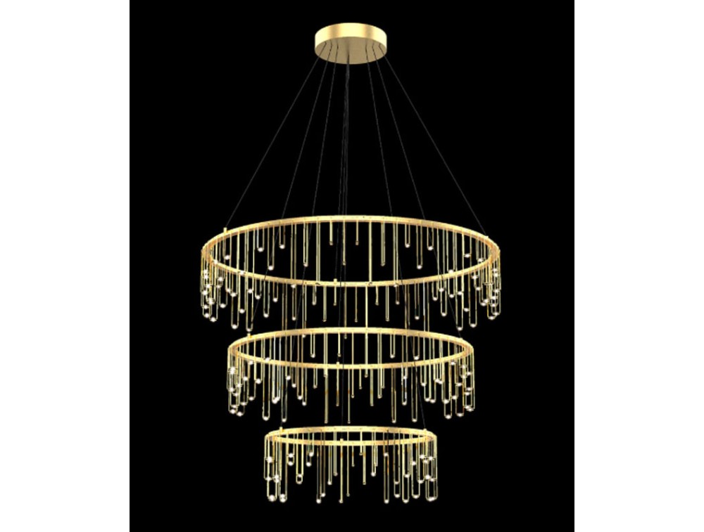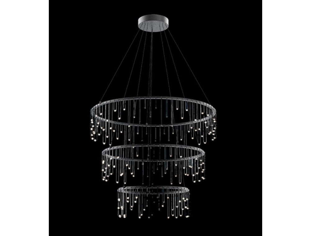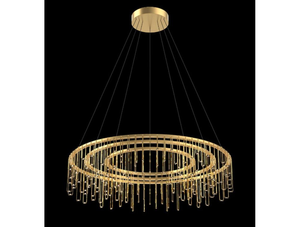 Crafted from brass with integrated double-sided LEDs. Ideal for decorating and illuminating kitchens, living rooms, and bedrooms. Available in black or gold chrome, it represents the explosion of light after the spark. Precise elements and shapes make this lamp suitable for any public or domestic setting. A rich cascade of light on three levels. Adjustable height.