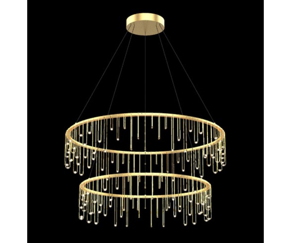 Made of brass with integrated double-sided LEDs. Ideal for decorating and illuminating kitchens, living rooms, and bedrooms. Available in black chrome or gold, it represents the explosion of light after the spark. Precise elements and shapes make this lamp suitable for any public or domestic setting. A rich cascade of light on two levels. Adjustable height.