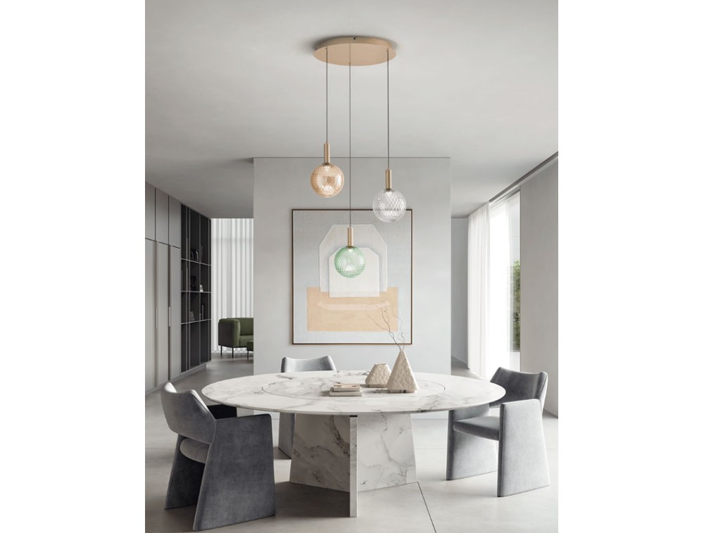 LED pendant light in colored blown glass, with a 13cm diameter balloton decoration. Complete with LED light element, decorative frame, cables, and a painted metal base in two finishes, including gold and black. Adjustable cables. Perfect for illuminating the kitchen, living room, and bedroom.