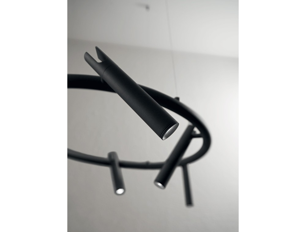 LED pendant lamp in painted metal with adjustable lights. Available in dove gray or black. Dimmable. It's the ideal solution for large open spaces, retail areas, or above large dining tables, where a bold yet subtle visual presence is required.