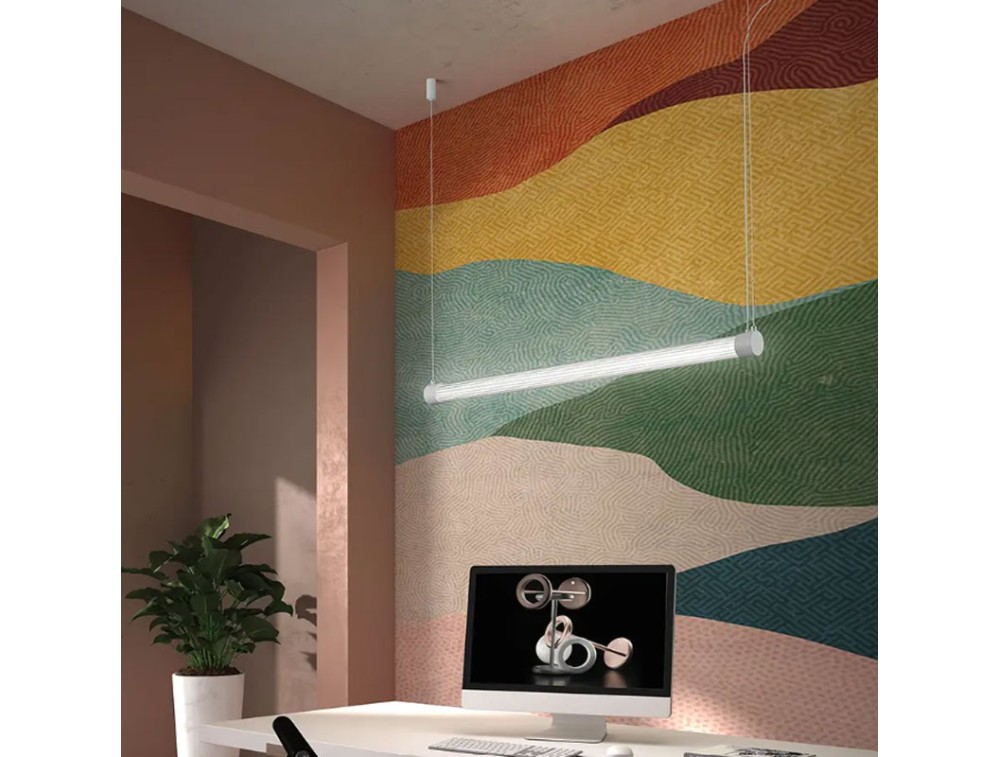 Linear suspension, integrated LED, white or black painted aluminum frame, clear ribbed methacrylate diffuser. Dimmable and dynamic with remote control. Perfect for decorating and illuminating kitchens, living rooms, and bedrooms.