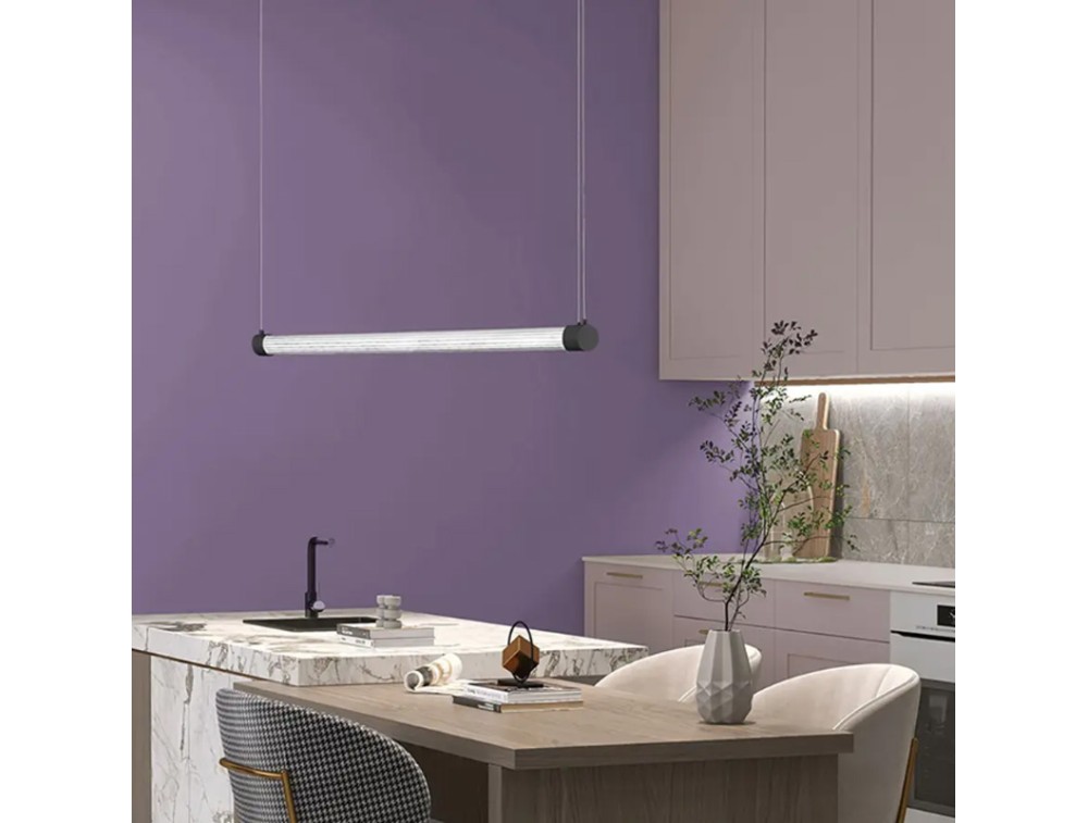 With a modern, linear design, shaped like an elongated tube, it's ideal for placing above an island or dining table in a contemporary kitchen. Its neutral design makes it a subtle focal point that pairs well with brightly colored walls and pastel-toned furniture. Free shipping and a 2-year warranty.