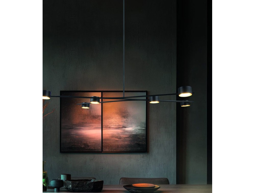 Metal suspension, ideal for illuminating and decorating the kitchen, living room, and bedroom. The lamps can be oriented in different directions. Adjustable height.