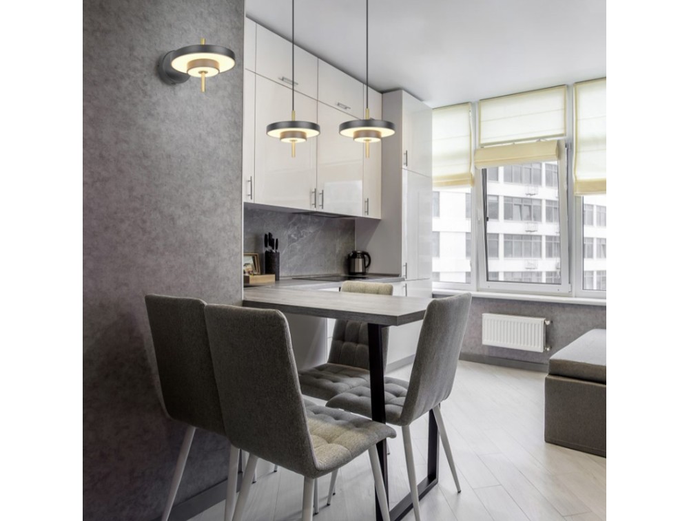 Metal suspension in warm gray and coffee or black and coffee. For kitchens, living rooms, bedrooms, and hallways. Dimmable and temperature-controlled. 5-year LED warranty and IP20 protection. Height-adjustable lamp.