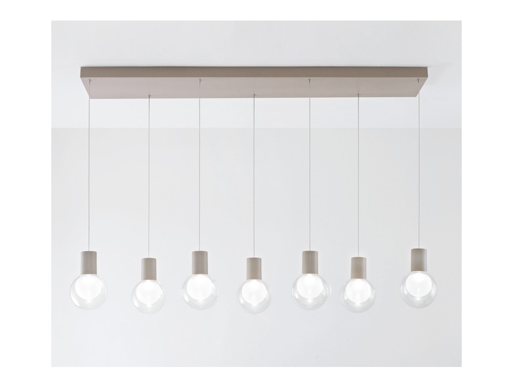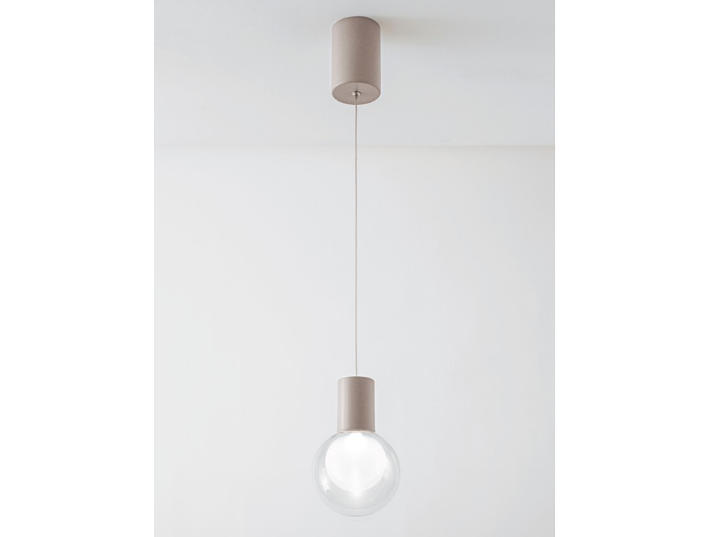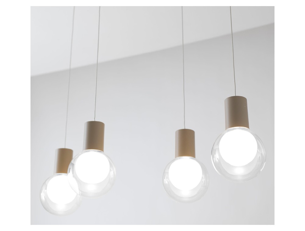 Suspension with an aluminum base and glass diffuser. Champagne color with integrated LED light source, warm 3000K light. Perfect for the living room, bedroom, kitchen, and hallway.