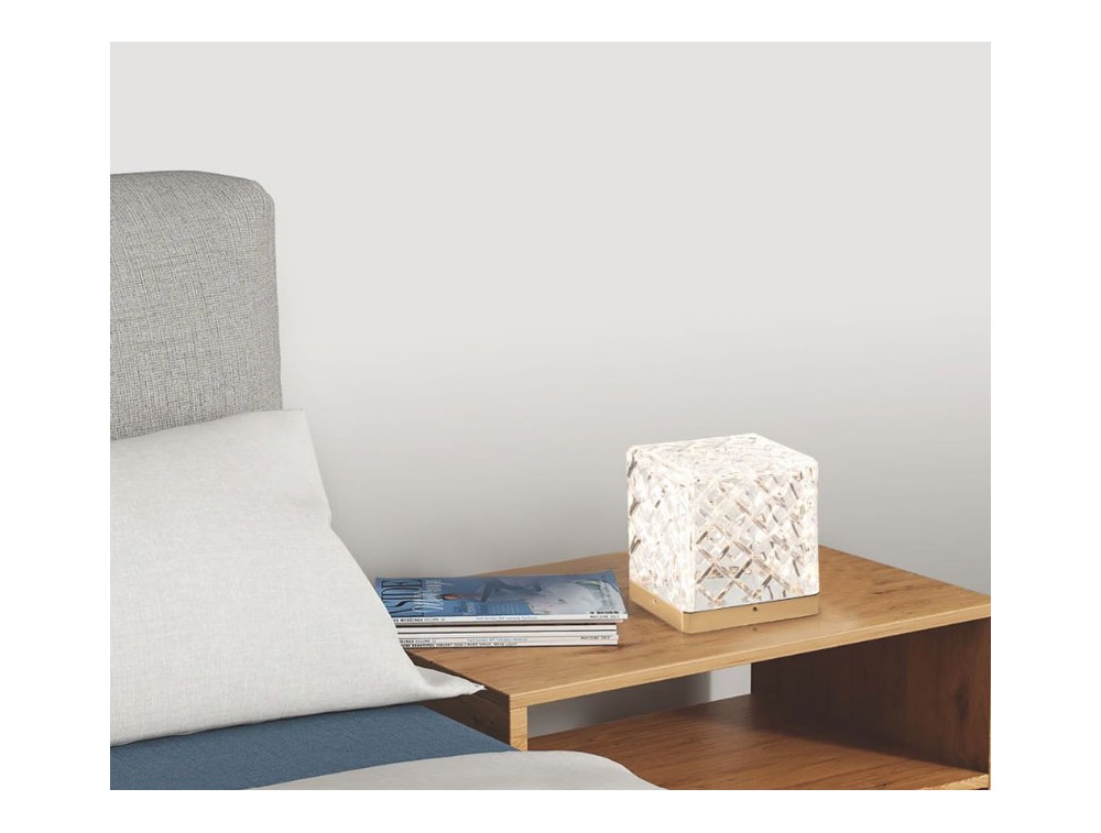 Table lamp with integrated LED, metal base and acrylic diffuser, available in chrome, gold, and black. Perfect for bedrooms, kitchens, living rooms, and hallways.