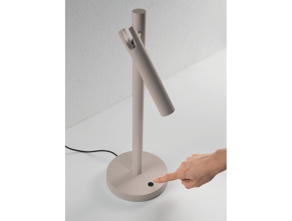 Painted metal LED table lamp with adjustable light. Available in dove gray or black. On/off switch and dimmer included. Dimmable. Despite the asymmetrical arm, the circular base balances the visual weight, conveying a sense of stability typical of high-end industrial design. Ideal for illuminating a reading corner or an artwork.
