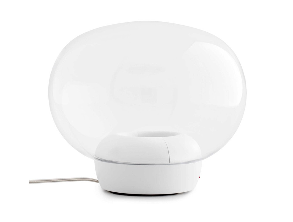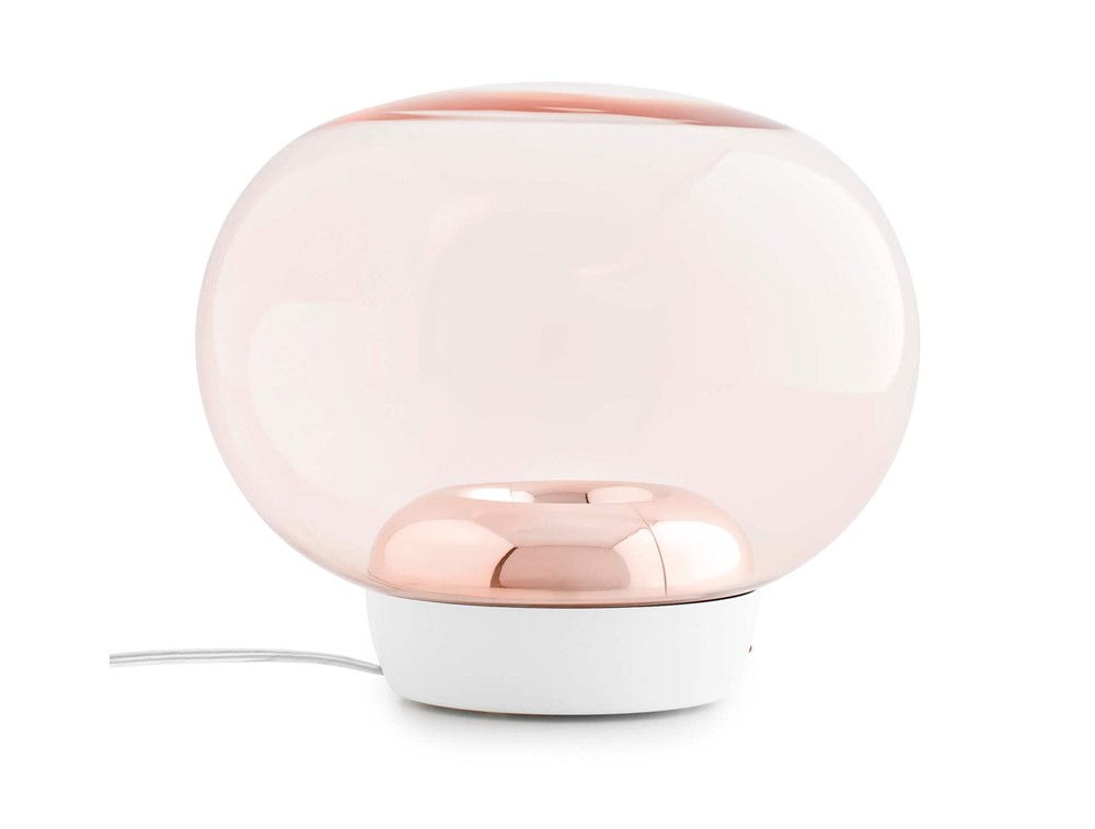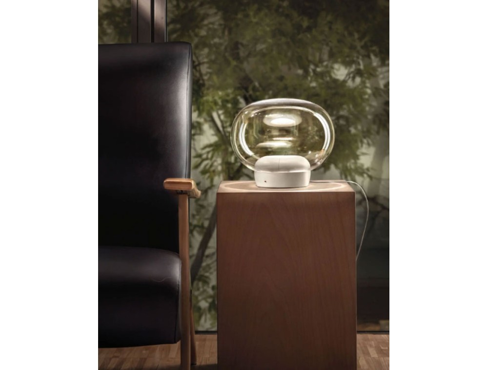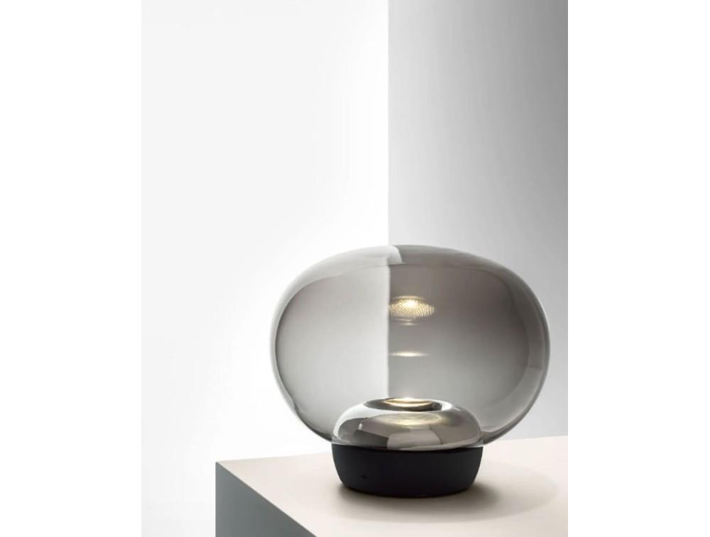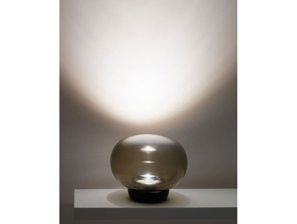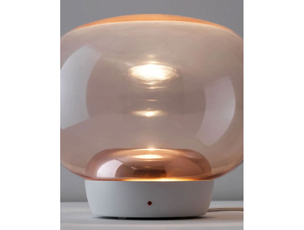 The La Mariée table lamp, designed by Mirco Crosatto in 2018, is a masterpiece of modern elegance. With its ethereal design and exquisite finishes, it adds a touch of charm to any space, whether used as a table lamp or a floor lamp. Crafted from blown pâté glass, it is available in exquisite shades: clear, smoked, copper, and gold. Each version is enhanced by an aluminum inner ring or galvanized finishes that add a touch of sophistication. Available in various combinations of finishes and bases, La Mariée adapts to any space. The metal base is painted black (with smoked glass) or white (for the other versions), completing the harmonious design with perfect details. La Mariée's slightly oval shape and dimmable top LED source diffuse a soft, atmospheric light. The honeycomb filter eliminates glare, offering a welcoming and classy illumination.