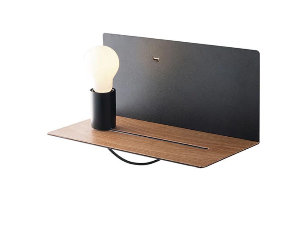 Embossed metal wall lamp available in white or black with a natural wood-colored shelf, movable bulb, and 2A USB port. For kitchens, living rooms, and bedrooms.