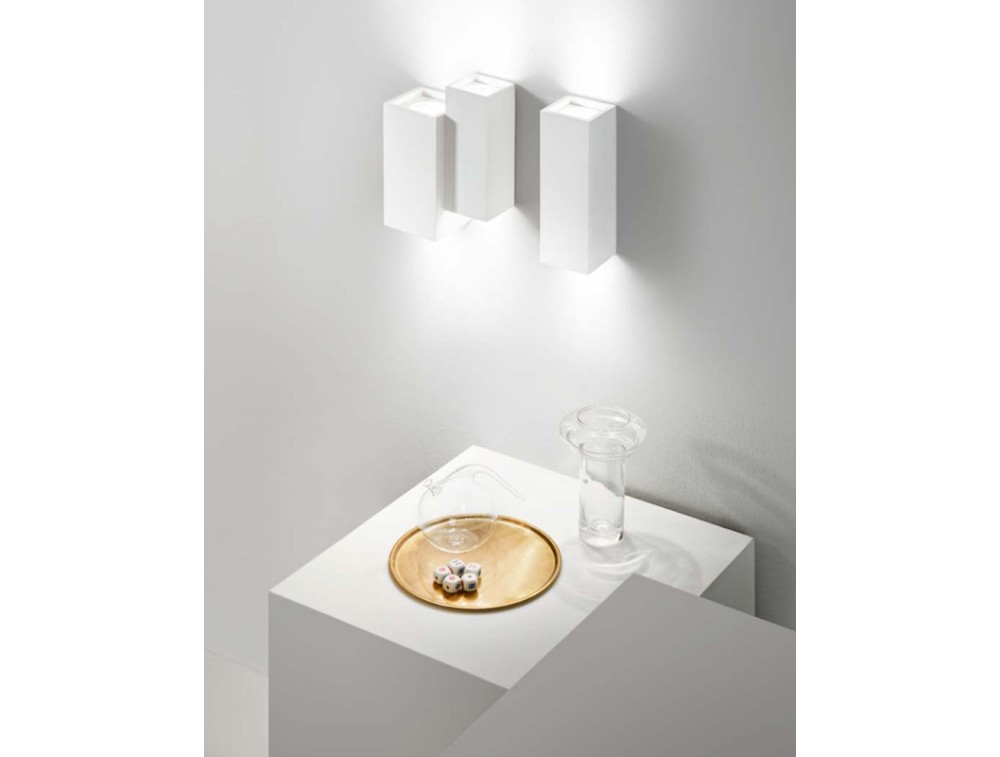 Wall lamps available in single or double compositions. Thanks to their dual-beam light, they offer versatile and uniform illumination. Their paintable plaster structure allows for customizable color. Ideal for kitchens, living rooms, and bedrooms.