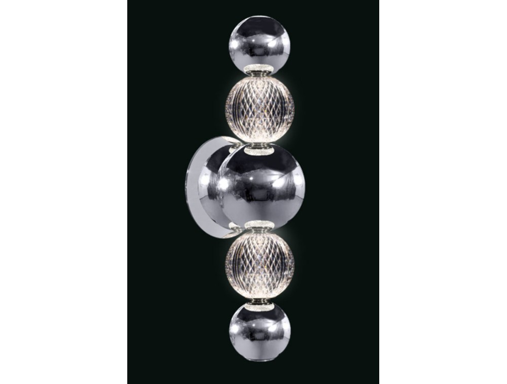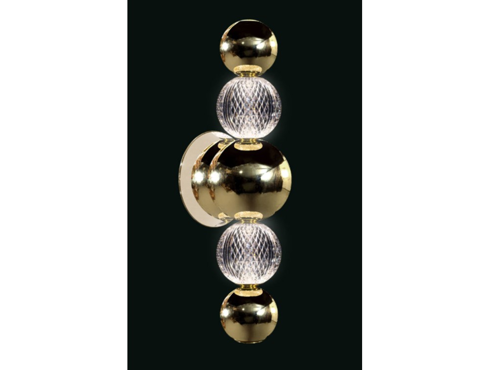 Wall lamp composed of a metal frame and acrylic spheres, lacquered in gold or chrome. Ideal for illuminating and decorating the kitchen, living room, hallway, and bedroom. Integrated LED light. Its visually striking design features a dense composition of spheres with mixed finishes, creating a truly sculptural effect. IP20 protection.