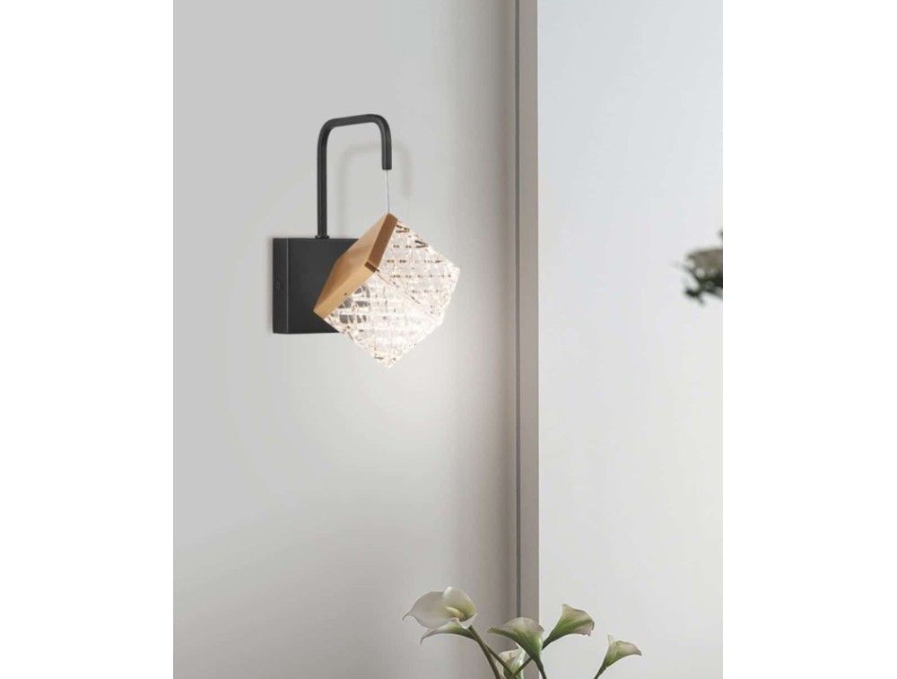 Wall lamp with integrated LED, metal base, and acrylic diffuser, available in chrome, gold, and black. Perfect for bedrooms, kitchens, living rooms, and hallways.