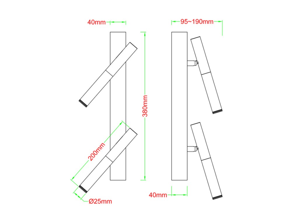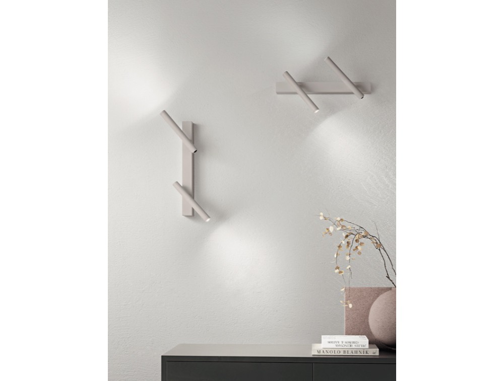 Painted metal LED wall lamp with adjustable lights. Available in dove gray or black. Includes an ON/OFF button and dimmer. Dimmable intensity. The light hitting the wall highlights the texture of the plaster, creating cones of shadow and light that decorate the room even without the addition of paintings or decorations. It's an ideal solution for hallways, bedheads, or to add character to an empty wall.