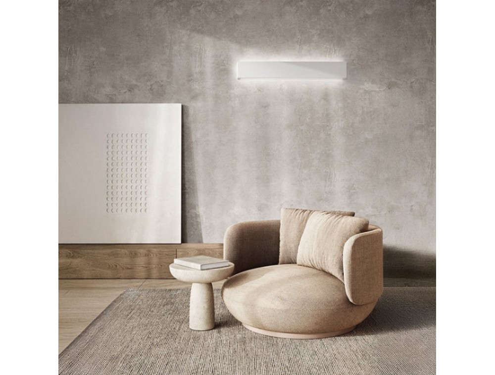 It features a clean, minimalist design, composed of a metal frame and a paintable plaster diffuser. This unique finish allows for customizable color, making it perfectly suited to colored walls for a coherent and harmonious visual effect. The indirect light provides soft, comfortable lighting, ideal for creating a welcoming atmosphere in the living room, hallway, bedroom, or contract spaces.